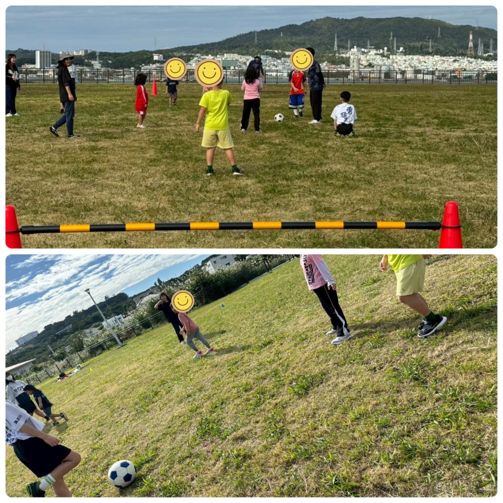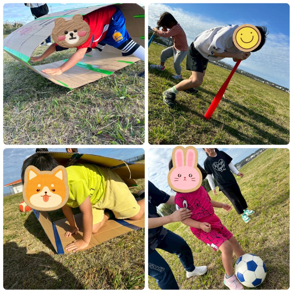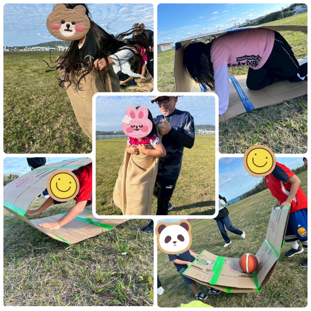 段ボールのキャタピラでトンネルくぐり、ぐるぐるバット、デカパン競争にサッカーと、盛りだくさんの内容で楽しみました😍開放感あふれる広場で思いきり体を動かして最高に盛り上がりました😆
